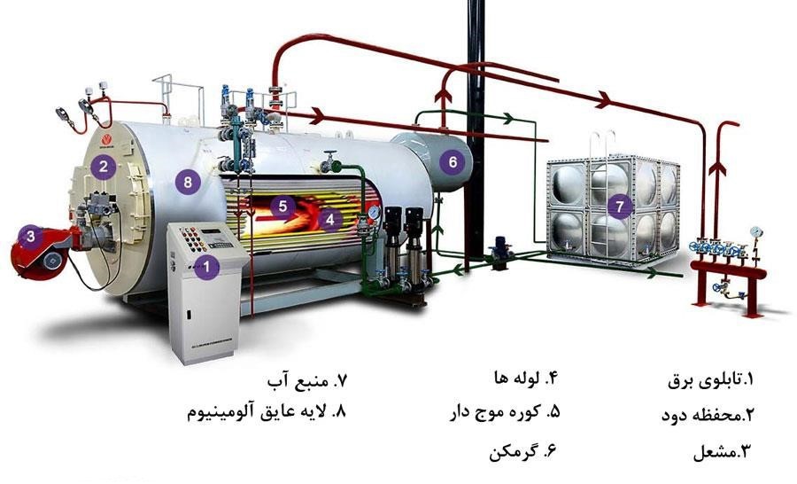 • بویلرها بیش از صد سال تولید می شوند و امروزه جایگاه ویژه ای در صنعت دارند. بسیاری از اجزای تشکیل دهنده دیگهای بخار شبیه یکدیگرند. در بخش بعدی طرز کار دیگ بخار و انواع بویلر فایرتیوب یک پاس، دو پاس ، سه پاس و چهار پاس را تشریح می کنیم . از انجا که دیگ بخار فایر تیوب بیشترین استفاده را در صنعت دارد اجزای تشکیل دهنده آن را در این بخش توضیح می دهیم . با دانستن اجزای آن بهتر می توانید تعمیر و نگهداری را انجام دهید. تصاویر زیر به شما کمک خواهد کرد تا اجزای اصلی دیگ بخار را بهتر بشناسید. دیگ بخار یا بویلر خود بخش اصلی یک سیستم مولد هست که شامل بدنه ، شبکه ، کوره ، لوله آتشخوار و شاسی می باشد.