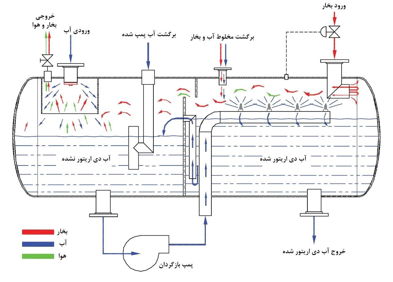 افزایش دما و حلالیت گازها در آب با هم نسبت عکس دارند. یعنی با افزایش دمای آب میزان حلالیت گاز در آب کم می شود. حلالیت گازها در آب با افزایش فشار بیشتر و با کاهش فشار کمتر خواهد شد. اصول کارکرد یک دی اریتور بر پایه افزایش دما و کاهش فشار هست. دی اریتور آب را در تماس با بخار گرم کرده باعث افزایش دمای آن شده ، همچنین فرآیند کاهش دمای بخار باعث ایجاد خلا نسبی شده در نتیجه گازهای محلول در آب از آن جدا می شوند. کار دیگری که دی اریتور انجام می دهد این هست که با گرم کردن آب مصرفی دیگ بخار از انبساط و انقباض آن جلوگیری می کند و راندمان دیگ بخار را نیز افزایش می دهد. انواع دی اریتور دی اریتور سینی دار