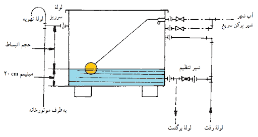 جهت جبران کمبود آب مورد نیاز سیستم، منبع انبساط باز بوسیله یک عدد شیر کنترل سطح یا شناور می تواند به آب شهری نیز متصل گردد.
